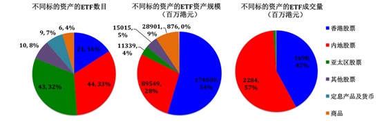 (注:香港市场上不同标的资产ETF的数目、资产总额和成交量对比,数据来源:香港交易所网站2015年10月统计数据。)