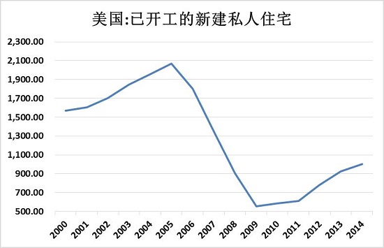 2001年美国IT领域泡沫破裂,经济陷入衰退,美联储采取了连续降息的扩张性货币政策。美联储的低利率政策导致市场中流动性过多,多余的流动性流入房地产市场,住房不断升值,房地产市场泡沫逐渐累积。2000年至2005年全美房屋价格指数增长了84%,如图表1所示。2005年美国新建住房200多万套,比2000年增长了31.8%,住房供给过剩,如图表2所示。(此处及以下数据来自Wind资讯)