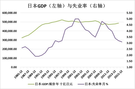 在日本房地产行业去产能的20多年里,建筑投资额从1991年的824036亿日元连续下降至2011年的432923亿日元,降幅达47.5%,同期城市土地价格指数下跌62.7%,如图表7所示。在这段时间里,日本经济发展缓慢,期间GDP增长几乎没有变化。与此同时,在日本这个有着独特职业文化的国度,失业率从1991年的2%上升到2001年的5%,并在接下来的10几年里保持在平均4%的水平,给民众生活造成了很大压力,如图表8所示。