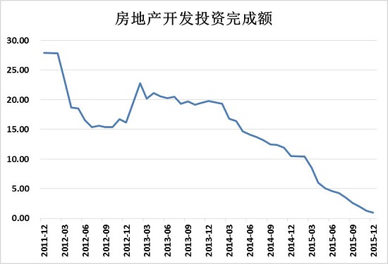 据中国国家统计局公布的数据,最近4年商品房库存数量逐年快速上升,截止2015年底,商品房待售面积已超过4亿5000万平方米,如图表9所示。与库存快速上升相对应的,房地产开发投资累计完成额月度同比从2014年以前的超过15%,下降到2015年12月的1%,如图表10所示。