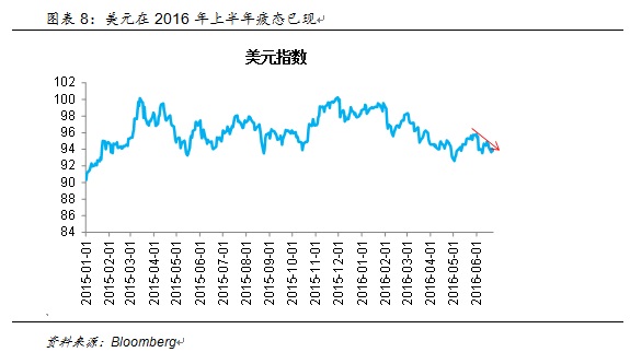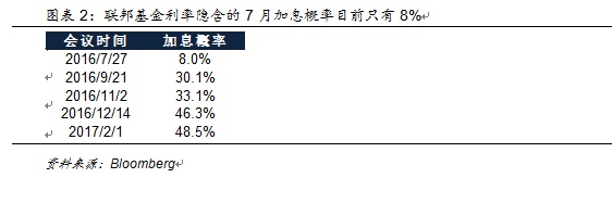 7月加息可能性不大。总体看来,美联储年内的整体加息节奏可谓是“没有最慢,只有更慢”,虽然市场普遍认为6月不加息的决议主要受到英国退欧时间节点的干扰,7月仍然存在加息的可能性,但事实上,只要之前公布的6月非农数据不足够强劲,这一可能性都微乎其微。事实上,在6月FOMC会议之后,联邦基金利率隐含的7月加息概率回落到只有8%,虽然点阵图指引的联储年内加息次数仍然是两次,但更多的与会者表示出“加息一次”的态度。