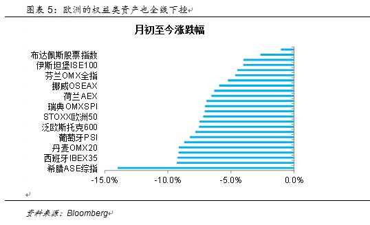 欧洲风险资产表现不佳,但如果退欧成真,未来还将进一步下挫。相比之下欧洲的市场更为惨烈,除东欧个别市场外,包括英国、德国、法国在内的传统发达市场跌幅大多超过5%,受制于英国退欧的阴影,权益类资产作为风险资产的代表遭到抛售。