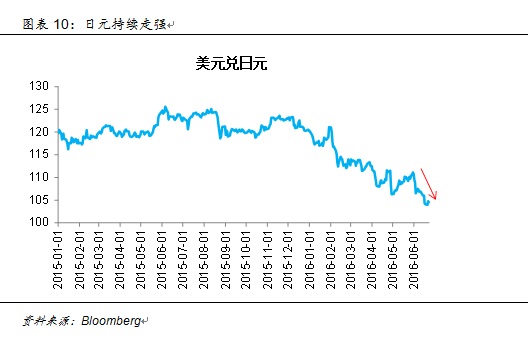 日本货币当局的弱势将使得日元继续走强。日央行已经在进一步宽松的货币政策上向市场表现出了局限性,“负利率”饱受市场非议,同时无论是通过买股还是买债,日本央行都已经竭尽全力,进一步购买日本国债和股市ETF的空间都极其有限。事实上,这一受限的货币政策已经被市场认知,日元开年以来不断走强,而从基本面看,虽然日本经济向好的态势并不明显,但同样向下空间不大,政府债务相对健康,这也为日元的上涨提供了支持。而短期的英国退欧又使得外汇交易员急于在全球寻找较为安全的投资标的,此时日元就成为了上佳的选择,未来下半年日元的表现仍然值得期待。