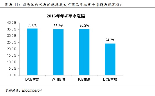 开年以来,大宗商品市场成为各大类资产中表现最抢眼的明星。原油价格带领下能源类大宗商品开年至今普遍表现不俗,WTI原油上涨35.2%,最高接近54美元,焦煤焦炭也都表现出色。在贵金属中,白银成为开年以来表现最好的品种,上涨25.1%,黄金上涨19.8%。
