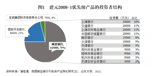 2006-2008年间是国有银行集中处置不良资产阶段,我国曾发行过4批相对标准化的证券化产品,分别为东元2006-1、信元2006-1、 建元2008-1、以及信元2008,这四单证券化产品均采用了优先级和次级债券的设计。以建元2008-1为例,我们来看看其优先级产品投资者的认购份额与占比。图1显示,优先级产品中21%与4%为国家开发银行和宝钢集团持有,而其他商业银行持有14.3亿元,比例高达75%。交通银行、邮政储蓄银行,以及多家城市银行参与了优先级产品投资。不良贷款拥有者与证券化产品的主要投资者都是商业银行。