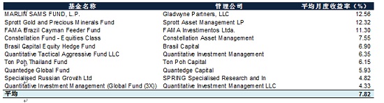 上半年业绩靓丽的大型对冲基金多投资于新兴市场。在单个对冲基金表现上,主要考察管理资产规模在1亿美金以上的大型对冲基金。表现最好的前十只大型对冲基金上半年平均月度收益率7.82%,其中排名3-5位的基金均主要投资于以巴西为主的拉丁美洲市场,此外排名第七位、第十位的基金分别投资于泰国和俄罗斯市场。反观排名靠后的十只大型基金,上半年平均月度收益率-4.23%,其中三只基金主要投资于欧洲市场,两只基金主要投资于日本市场。
