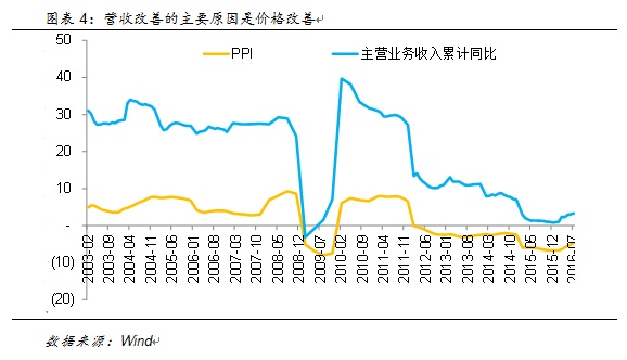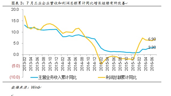 7月工业企业主营业务收入累计同比增长3.3%,利润总额累计同比增长6.9%,延续了年初以来的改善趋势,其中价格的修复是收入改善的主因,7月工业品价格有所回暖,7月PPI生产资料指数累计同比增速由6月的-5.1%跌幅收窄到-4.7%,带动工业企业营收增长。工业企业利润改善更为重要的原因是大宗商品价格的回暖,从历史上看,由于工业企业样本中钢铁、煤炭、有色金属等企业占比高,大宗商品价格往往会对这些企业的营收产生影响,7月在国内供给侧改革的推进下,煤炭、黑色金属和有色金属价格都有明显反弹,带动这些行业回暖。