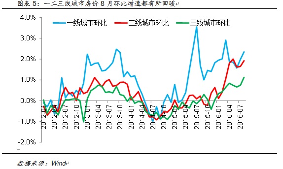 房地产市场在8月经历了一波回暖,一二三线城市房价在8月分别环比增长2.3%/1.9%/1.1%,这主要是由于8月下旬部分城市出现了楼市收紧的政策预期,导致部分需求开始提前消化。