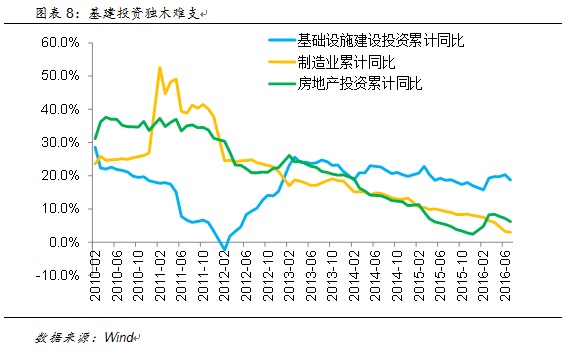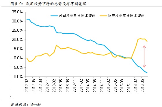但基建投资未来的后续增长难以持续,主要原因在于民间投资并没有跟上。2016年以来,民间投资下滑的态势并没有缓解,尤其是5月份开始呈现加速下滑的态势,从此前的5%以上下滑到7月的2.1%。导致虽然年初以来政府财政投入呈现高速增长,特别是3月以来,一直维持在20%以上的同比增速,但整体的FAI增速仍然不断下滑。