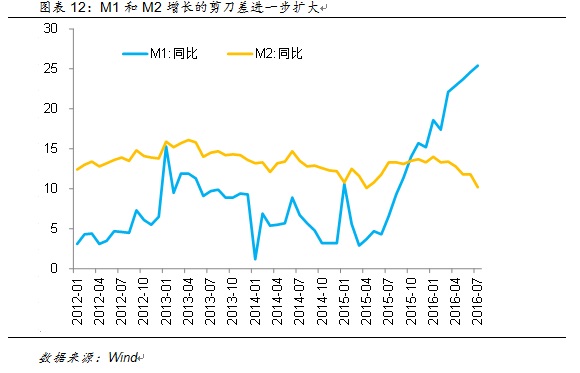 PPP的方式可能行之有效的一个原因在于能够调动民间资金的投资热情,事实上,实体企业并不缺乏流动性,目前来看,企业只是把多余的资金以定期存款的方式闲置在账面上,可以通过一个指标来考察这一现象,M1和M2的差额主要是居民的储蓄存款和企业定期存款,二者的剪刀差在2015年的下半年开始增长,目前仍在扩大。