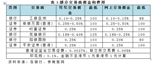 根据沪港通启动初期的报道,各券商往往采取低佣金吸引开户,如国金证券,其佣金宝用户港股交易佣金率为万分之一点五,此外,海通证券万分之三,华泰证券万分之五,长江证券万分之八,渤海证券万分之十,银河证券万分之十八。由于港股通的开通门槛为50万元,其佣金费率普遍高于目前券商的A股交易费率,券商A股交易佣金一般都在万分之五以内。目前各券商佣金可能有所调整,但量级基本不变,投资者在开户前可咨询营业部了解最新的佣金费率。另外,如果投资者持有港股通证券,即使不交易,也需每日缴纳证券组合费(即香港结算根据每自然日账户港股市值收取一定费率,根据市值大小划分为0.003%-0.008%的不同费率档次)。