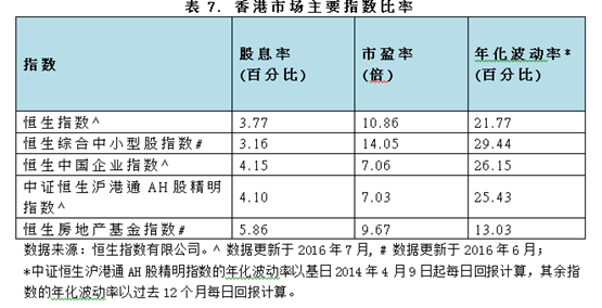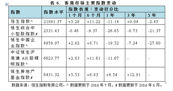 表6显示,总体来看恒生中小型股指数相对于恒生指数波幅较大。恒生综合中小型股指数和恒生中国企业指数受到A股市场刚刚过去一周年的“股灾”影响,在1年内跌幅较大,在19%以上。同期,恒生指数和中证恒生沪港通AH股精明指数也有较大范围的下跌,而恒生房地产基金指数在一年内有4.54%的增长。