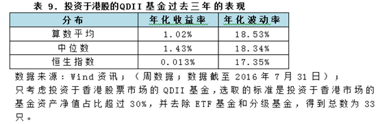 表9是投资于港股的QDII基金过去三年的表现总结,并列出恒生指数表现作为比较基准。可以看出QDII基金的收益情况的均值、中位值高于恒生指数,也就是说超过一半的QDII基金回报率高于