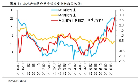 从中短周期视角看,房地产的金融属性表现得更强,而对这一点最重要的影响因素是货币政策,信贷政策的松紧程度、利率水平和实体经济的流动性程度都会对中短期的房地产价格产生重要影响。如果将房地产价格和货币供应量指标(M1和M2同比增速)进行比较可以发现,货币政策的收紧与放松成为影响房地产中短期价格波动的最重要指标。进一步地,M1同比增速和房地产价格指数的相关性更高,表明流动性成为房地产价格的重要推手,房地产也因此成为一类极易泡沫化的资产。