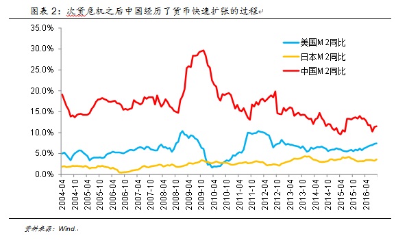 如果回头看,货币扩张的过程并不是始于今年,而是从2008年金融危机之后就已经悄然开始。次贷危机之后,为对冲经济下行的压力,各国货币当局都或多或少采取了宽松的货币政策以提振经济,都开始了货币的加速扩张,其中中国央行最为激进,包括“四万亿”在内的一系列经济刺激计划带动M2增速一度接近30%。