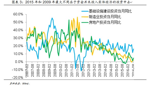 虽然货币供应量从次贷危机之后开始,但流动性泛滥和资产的泡沫化进程则要开始得更晚。2015年和2009年的最大不同在于,09年刺激计划施行后,基建投资被迅速激活,资金确实流入到实体经济中,而2014年底降息开启新的货币宽松周期之后,从三大固定资产投资的角度看,实体经济都没有吸纳这些新创造出来的货币,反而使得M1和M2增速之间的差距越来越大,空转的货币增多。