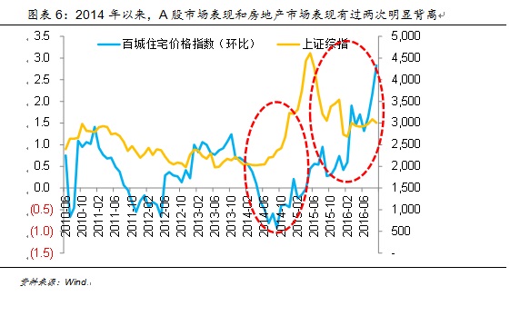 会产生这样疑问的投资者显然是受到2014-15年股市和楼市表现的影响,事实上,从2014年开始,中国的A股市场表现和房地产市场作为金融资产中最易泡沫化的两类,其表现开始出现了较为明显的背离。2014年之后房价上涨速度开始趋缓甚至出现下跌,而股票市场开始逐渐估值修复的过程悄然上涨。当年年底央行降息开启了新一轮货币宽松周期之后,A股开始了一轮“疯牛”,而地产行业也受益于宽松的信贷政策开始回暖,A股牛市的财富效应反过来又增强了购房者的购房能力,两个市场一同上涨。而2015年年中股灾开始,A股急转直下,但房地产市场热度不减。2016年以来A股市场基本横盘,而房价一飞冲天,特别是部分热点二线城市例如合肥、苏州、厦门等,房价涨幅惊人。