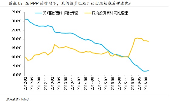 此外,流动性并不会永远在各种金融资产之间挪移,可能开始逐渐进入实体经济。只要资金没有离开银行体系,在资金成本的压力下就需要寻找去处。对于银行而言,如果整体货币不收紧,房贷受阻之后的下一个信贷投放方向是什么?同下半年财政刺激的大方向相契合的,基建类贷款可能成为一个好选择。而中国政府当前热推的PPP可能正在发挥作用,通过财政资金撬动民间投资,民间投资已经开始出现触底反弹迹象。如果一旦经济开始企稳,能够提供更高的资金回报率(ROE),资金会逐渐从金融资产中撤出,进入实体经济。