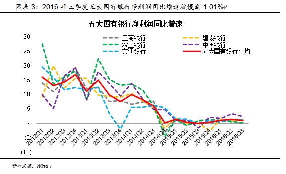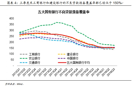 更加值得注意的是,从商业银行体系的支柱——中农工建交五大国有银行的财务数据看,不良资产的压力已经不容小觑。2016年三季度五大国有银行净利润同比增速进一步放缓到1.01%,其中工商银行单季度负增长0.23%。而这一微弱的正增长也与这些银行在拨备计提政策方面的放松有关,五大国有银行三季度末的平均不良贷款拨备覆盖率为152.76%,其中工商银行136.14%,已经连续三个季度跌破监管红线的150%,建设银行148.78%,也加入了这一队伍。如果这两家国有大行坚持拨备覆盖率的红线,净利润负增长将成为必然。可见,拨备作为不良资产风险的缓冲池,其作用已经变得微乎其微。