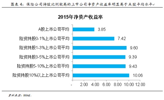如果能够以权益法记账,则二级市场股票价格变动带来的影响将被消除,保险公司按照其持股比例享有被投资公司的净利润和其它综合收益,因此,只要企业盈利能力持续稳定向好,保险公司的投资收益就能够得到保证。在这一阶段,保险资金关注的重点则在于被投资标的的盈利能力,最为通俗的衡量指标是净资产收益率,即ROE。以2015年全年数据为例,A股上市公司平均摊薄净资产收益率为3.85%,而险资持股比例较高的上市公司明显高于这一水平,尤其是险资持股比例大于10%的上市公司平均摊薄ROE为10.06%,高出A股均值6.21%。