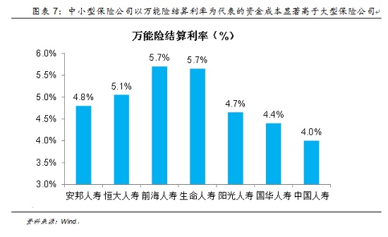 万能保险是一类包含保险保障功能,同时在一个投资账户拥有一定资产价值的人身保险产品,购买万能保险的投保人一方面缴纳了用于保险保障的保费,另一部分资金则用于投资。在结算时,投资收益上不封顶,下设最低保证利率,保险公司通过结算利率对投保人实际的投资收益率进行调节。这种类型的保险产品从2015年开始成为部分中小保险公司实现“弯道超车”,抢占大型保险公司市场份额的“利器”。以2016年11月销售的代表性产品为例,中小型保险公司的资金成本显著高于以中国人寿为代表的大型保险公司,而其中前海、生命、恒大等保险公司资金成本甚至超过5%。在这样的压力下,虽然投资端的收益率降低,但大型保险公司也不能轻易降低负债端的成本,以免造成市场份额的大幅流失,全行业的负债成本相对刚性,但资产端却在不断受损。