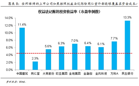从与所投资标的的协同看,安邦所投资的标的既包含民生银行这样能够在银行渠道对保险销售有所协助的银行股,也包括低估值、能够在养老地产方面产生协同的地产股例如万科和金地集团,同时也包括同仁堂这样与大健康产业相关的医药股,这些投资所产生的“1+1>2”的效应都较为明显。