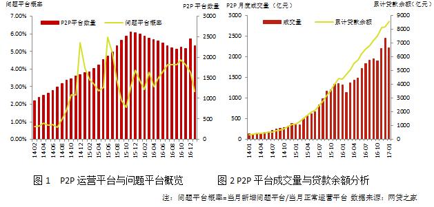 我国P2P行业的发展可大致分为以下几个阶段:第一,2012年至2013年,平台处于缓慢增长期,平台数量与成交额均增长缓慢,2012年底P2P平台的贷款余额仅56亿元。第二,2014年平台进入高速增长阶段。从平台数量上看,图1显示2014年1月正常运营的平台数量仅为880家,2014年12月增长至1575家,2015年12月增长至2595家,2016年12月正常运营平台数量为2448家。从成交量上看,图2显示2014年全年平台成交量为2528.17亿元,2015年全年平台成交量增长至9823.04亿元,2016年全年平台成交量增长至20636.26亿元。从贷款余额上看,2014年12月贷款余额为1036亿元,2015年12月底,贷款余额快速增长至4005.43亿元,2016年底贷款余额为8162.24亿元。但在高速增长的同时,P2P行业也涌现出一些问题,平台质量良莠不齐、问题平台不断增长,2014年共出现227家问题平台,2015年全年问题平台为1206家,2016年全年问题平台为1849家。问题平台事件类型包括诈骗跑路、提现困难和经侦介入,极大影响了行业的正常竞争秩序。