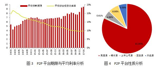 第二,平台借贷期限不断增长,图3显示P2P平台的年度借贷平均期限由2014年的5.85月增长至2016年的7.78月,2017年1月平台借贷期限增长至9.48月。原因在于,P2P行业经历了行业整合与存量淘汰后,大平台不断显示出规模优势,呈现出大成交量与长借款期限的特征,体现出P2P行业信用逐渐向好、竞争逐渐规范。