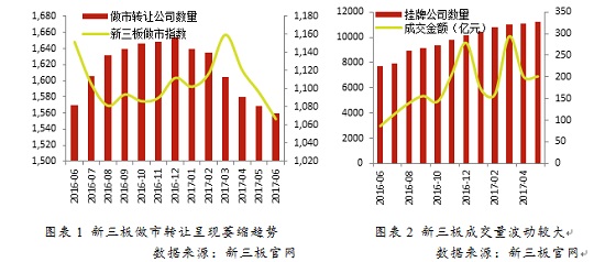 而目前新三板却呈现二者的失调发展:一方面,谋求转板的新三板企业不断增加,新三板成为IPO最大的后备军。据统计2015年至2017年5月新三板共有485家企业宣布启动IPO进程,2017年1月至5月,共有182家企业宣布启动IPO。另一方面,新三板挂牌企业增速不断下降,2015-2016年新三板挂牌企业数量的月度复合增速为7.65%,而2017年1月至5月这一数字陡降至1.83%,还有近80家企业在挂牌半年内就摘牌。同时,2016年下半年以来,新三板市场上做市企业的数量出现下滑,2017年一季度,新三板做市企业从年初的1653家回落至2017年6月的1559家。 2017年4月之后,新三板做市指数处于下降区间,也反映出做市券商做市意愿下降。新三板成交量波动较大,未呈现持续上涨趋势。