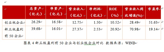 从企业规模上看,新三板盈利能力最强的齐鲁银行总资产与净资产分别为2071.6亿元和128.78亿元,2016年净利润达到16.4亿元,将对均值产生较大影响。剔除齐鲁银行后,计算得到新三板盈利前50的企业总资产均值为39.68亿元,大于创业板企业的平均值(26.29亿元),新三板盈利前50的企业净资产均值为16.01亿元,与创业板企业均值基本持平(16.58亿元)。故从整体规模上看,新三板中最为优秀的企业规模略大于创业板企业均值。从盈利能力上看,新三板盈利排名前50位的企业营业收入为27.37 亿元,高于创业板企业(12.75亿元);净利润为2.53亿元,高于创业板企业(1.5亿元);企业ROE均值为20.92%,高于创业板企业(10.52%);企业营业收入同比增速(70.98%)也高于创业板企业(28.49%)。总结来看,新三板排名前50 企业的营业收入、盈利能力、净利润等指标均优于创业板企业。
