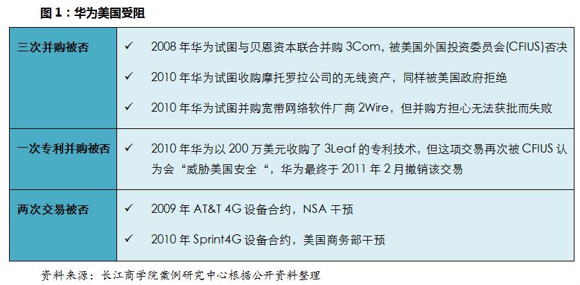 2008年以后,华为试图通过并购策略进入美国,却屡屡受阻。其标志性的事件如下: