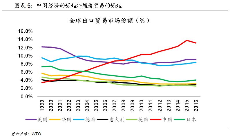 有观点认为,中国的崛起,伴随的是贸易的崛起,而这得益于中国加入WTO以及全球化的大浪潮,中国正是抓住了这一契机,从而在世界经济中占据了更加重要的地位。从在全球出口贸易中所占的市场份额看,中国一路从1999年的3.4%提升到2016年的13.2%,而同时期美国从12.2%下降到9.1%,欧盟从41.3%下降到33.7%,日本从7.3%下降到4.0%。