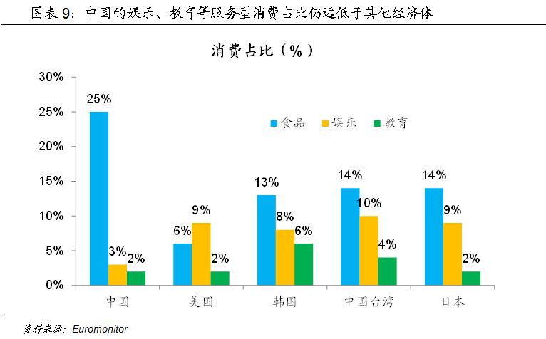 服务业的发展也将是未来一段时间的重点。随着传统经济的改革和转型,中国的劳动力结构将发生较大的转变,越来越多的劳动者将从传统老经济行业离开,而服务业的大发展将有助于吸纳这些劳动力。人口老龄化等因素虽然存在负面影响,但同时也将带来新的机遇,例如医疗、养老、保险等服务领域都可能迎来较大的需求增长。从横向对比看,中国的娱乐、教育等服务型消费占比仍远低于美国、韩国、日本和中国台湾等经济体,食品消费仍然占据了整体消费者篮子的四分之一,这一比例显得仍然过高,预计随着人均收入水平的继续提高,中国的服务型消费将迎来大发展。