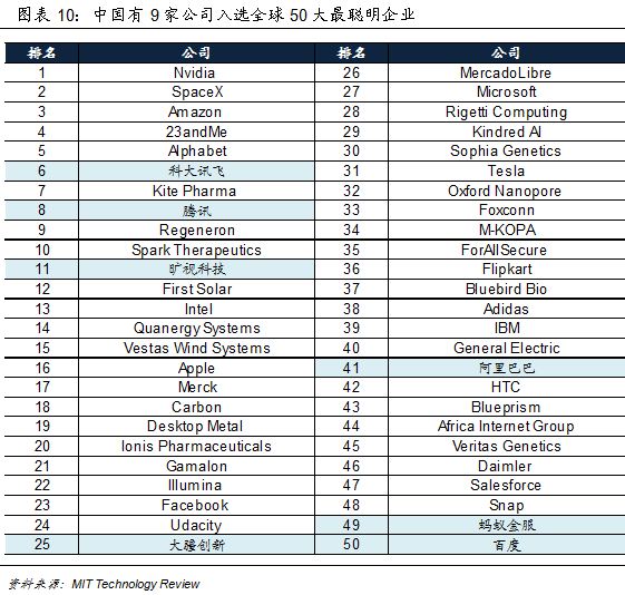 包括腾讯、阿里巴巴、百度、京东、华为、小米等在内的中国公司已经开始在科技上追赶同业,并开始具备较强的品牌力。而根据MIT Technology Review评选出的全球50大最聪明企业,中国包括科大讯飞、旷视科技、大疆创新等在内的9家公司已经入选这一榜单,具备了领先的科技创新能力。