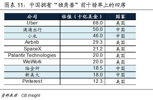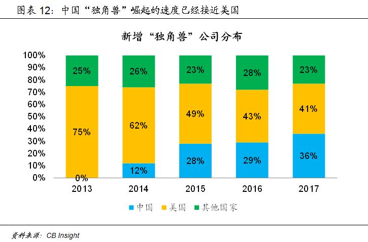 而中国企业的创新远不止于此,根据CB Insight的数据显示,中国是除美国外拥有“独角兽”最多的国家,在上榜的214家企业中,中国占据59家,在估值排名前十的“超级独角兽”榜单上,中国拥有包括滴滴出行、小米、陆金所和新美大在内的四席,其他全部为美国企业。而中国的“独角兽”崛起的速度甚至已经和美国接近,在2017年新近涌现的“独角兽”中,41%来自美国,36%来自中国,中美两国已经占到总数的近八成,这些“独角兽”未来的资本化都将继续帮助中国保持在这一领域的领先优势。