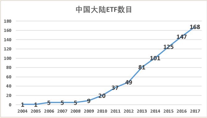 中国大陆第一只ETF,华夏上证50ETF,诞生于2004年,追踪上证50指数。到了2010年,大陆ETF市场开始发展迅速。截至2017年10月18日,中国大陆ETF总共168只,非货币市场基金的ETF数量为138只,其中股票型ETF有128只。图1列出了大陆年度ETF的数量。