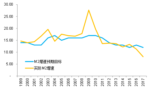 图表2:2017年实际M2同比增速大幅低于年初政府工作报告中设定的目标