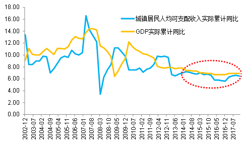 图表6:中国人均可支配收入实际增速已经慢于GDP实际增速
