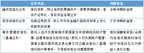 “受人之托,代人理财”是信托行业最初的发展宗旨。在其它国家,信托基金作为实体法人,代表受益人管理资产,并收取管理费。而在我国以商业银行为中心的金融体系中,信托与银行合作,衍生出融资、投资等职能。2014年银监会《关于调整信托公司净资本计算标准有关事项的通知(征求意见稿)》中将信托业务按照功能划分为三种:融资类信托业务、投资类信托业务、事务管理类信托业务。其中,事务管理类即所谓的通道业务,具体业务内涵参见表1。