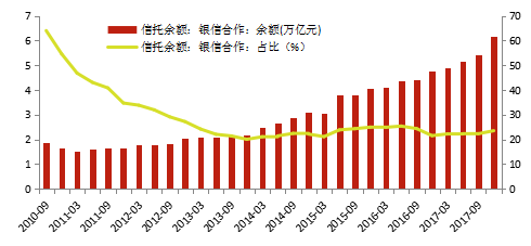 2012年底,银信合作存量规模为2.03万亿元,占信托行业整体规模的比重为27.18%。在以银信合作为主的通道业务的带动之下,信托整体资产管理规模不断增长,由2008年底的1.22万亿元增长至2012年底的 7.47万亿元,4年之间增长了6倍多,年度复合增速达到57%。2017年底,银信合作余额为6.17亿元,占信托行业整体管理资产的23.51%。