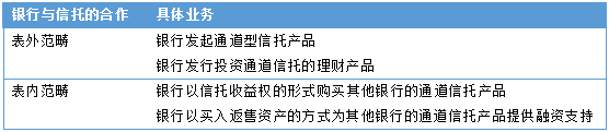 首先,在表外范畴上看,银行可直接发起通道型信托产品或发行投资于信托产品的理财产品。前者是指银行将信贷资金购买信托公司的通道型信托产品,后者是指银行发行表外理财,筹措资金后投资于信托产品。二者的区别在于银行资金来源不同(前者是银行信贷资金,后者是发行表外理财筹措资金)。