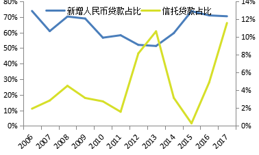 上述业务具有影子银行性质:一方面,银行在发放贷款时,可能受限于存贷比、资本充足率、投资方向等方面的限制,而通过与信托的合作使银行信贷资金绕开上述限制。银信合作承担了信贷的职能,但却规避了信贷的监管,因此出现类影子银行特征。另一方面,投资者在购买此类信托产品时,由于对银行隐性担保与刚性兑付的依赖,放松了风险甄别与风险承担,从投资者角度也具有类存款的性质。从社会融资规模的构成上看,2010年后新增人民币贷款占社会融资规模的比重不断下降,而信托贷款占比则迅速上升,2013年新增人民币贷款占社融规模的比重降至51.35%,信托贷款占社融比重上升至10.63%,这与银信合作业务的崛起密切相关。2014年之后受到基金子公司与券商资管等其他资管渠道的挤压,信托贷款占社融的比重在2015年降至低点(0.28%)。