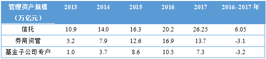 2012年,信托规模增速放缓,反映出金融市场环境的深刻变化。2012年券商资管与基金子公司开始开展非标业务与通道业务,与信托形成激烈竞争。受益于宽松的政策环境,基金子公司资产管理规模由2013年的0.97万亿元增长至2016年底的10.5万亿元,券商资管规模由2013年的5.2万亿元增长至2016年的16.9万亿元,一定程度上挤占了信托的市场份额。