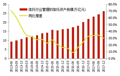 在政策相对紧缩的条件下,上述替代效应带来了信托资产规模的增长,参照图表8,信托行业资产管理规模由2016年的20.2万亿元上升至2017年的26.25万亿元,但增速有所下降。信托行业受到金融去杠杆的影响,行业大规模扩张将受到一定限制。