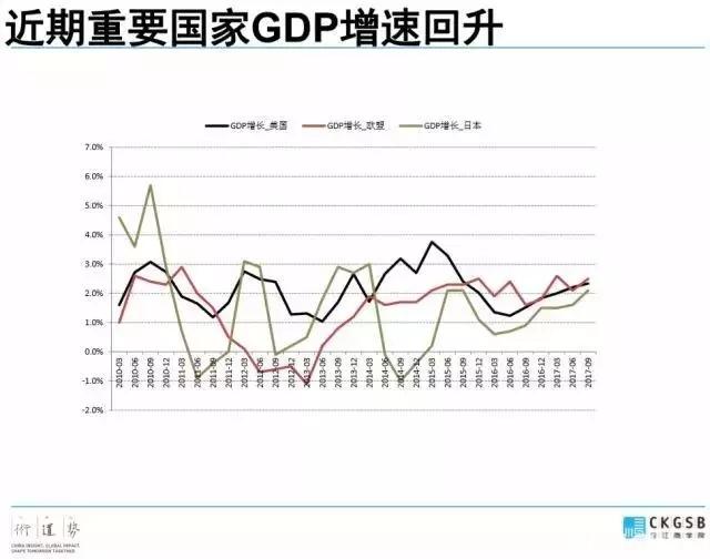 我们对全球范围内的一些宏观数据做研究,发现了一个重要规律:全球经济从2008年金融危机以来,不间断地出现过各种各样的问题。2016年以前,全球几个重要的经济体(中国、美国、欧盟、日本等)都出现过问题,但到2016年下半年,全球所有重要的经济体都实现了GDP增长,这成为了当今全球化的新常态。