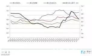 我们再看整个外汇储备和汇率的变化,图表中的黑线表示人民币兑美元的汇率。2015年9月以前,人民币兑美元的汇率一直在升高,但通过政府对外汇的管控,人民币又重新升值,现在基本稳定到6.3左右。