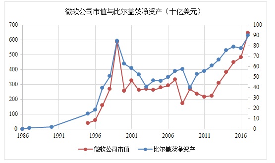 那么拉尔森管理盖茨资产的风险控制效果如何呢?我们对比盖茨的净值曲线和微软公司市值曲线,不难发现,在美国股市经历2000 年互联网泡沫破裂和2008 年金融危机重创时,拉尔森所管理的盖茨个人财富受到的冲击,但比微软公司的市值受到的冲击小。同时,微软的市值一度跌去顶峰2/3,而盖茨的回撤只在1/2 多。特别是,随着拉尔森逐步出售盖茨持有的微软公司的股票,盖茨的净资产与微软的市值的相关性逐步降低。以上的对比数据说明了,“资产多元化投资”的理念,让比尔盖茨的资产波动大大降低了。