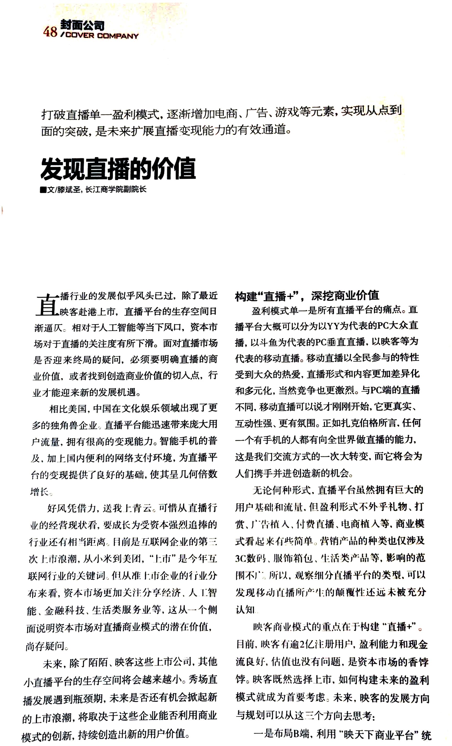 映客商业模式的重点在于构建“直播+”。目前,映客有逾2亿注册用户,盈利能力和现金流良好,估值也没有问题,是资本市场的香饽饽。映客既然选择上市,如何构建未来的盈利模式就成为首要考虑。未来,映客的发展方向与规划可以从这三个方向去思考: