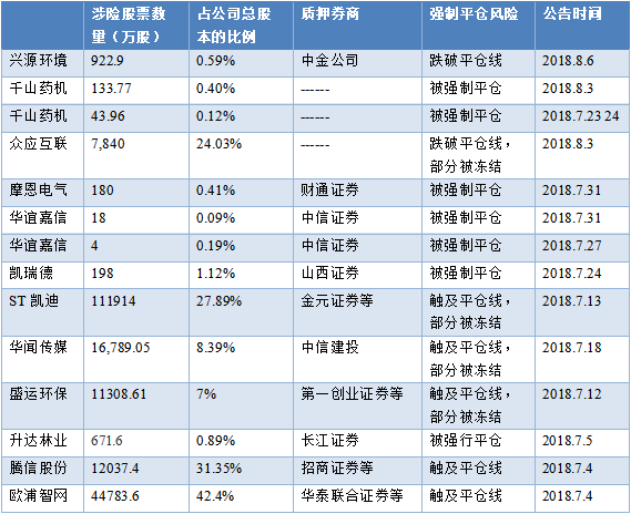 为了阐述上述“股价下降-平仓-股价进一步下降”内生加速循环的观点,我们分析2018年7月A股市场出现的跌破平仓线或被强制平仓事件,分析其对股价的影响:2018年7月,有千山药机、华谊嘉信、凯瑞德、摩恩电气、升达林业等五家公司被强制平仓,同时多家公司发布公告称股价跌落平仓线。当公司股价跌落平仓线时,股票也不一定立即进行平仓处理,一方面,股价跌破平仓线后股东可通过补充保证金、补充抵押物、与金融机构协商进行贷款展期等积极措施避免股票被平仓,例如兴源环境、迪威迅等企业;另一方面,部分股票被冻结(众应互联、ST凯迪等),即使跌破了平仓线也无法进行平仓处理。
