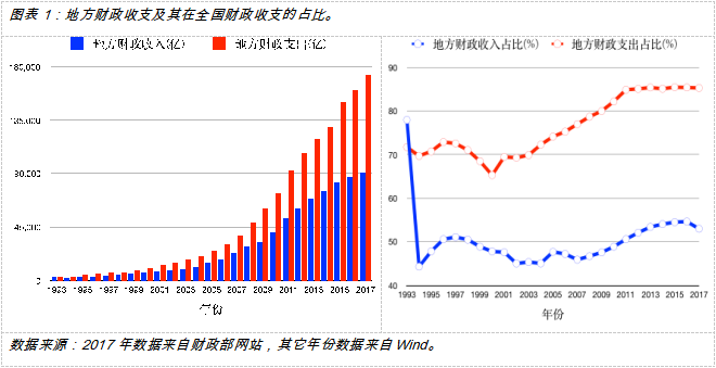 从图表1我们可以很清晰地看出,地方财政在1993年是略有盈余的,从1994年开始,地方财政收入就跟不上地方财政支出的步伐了,且缺口越来越大。地方财政收入占全国财政收入的比例从1993年的78%陡然掉到了1994年的44%。从1994年开始,地方财政收入占比在50%左右、而地方财政支出占全国财政支出的比例在80%左右。相比于中央政府,地方政府是分更少的钱、做更多的事。